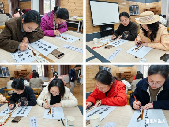 理论讲解结束后进入实操环节。校工会为每位参与者精心准备了纸签、竹签、毛笔及楚简文字临摹样板,方便大家零基础上手。在周老师的现场指导下,女教职工们先静心练笔、熟悉笔法,随后提笔蘸墨,在纸签与竹签上认真书写楚辞吉语、师道箴言等内容。一笔一画、一撇一捺间,既有对传统书法的敬畏,也饱含对生活与教育事业的美好期许。大家专注投入、相互交流,在动手实践中真切感受楚简文字的古朴韵味,在笔墨挥洒中释放工作压力,涵养文化素养,创作完成一件件兼具楚风底蕴与个人特色的文创书签,现场墨香四溢、暖意融融。